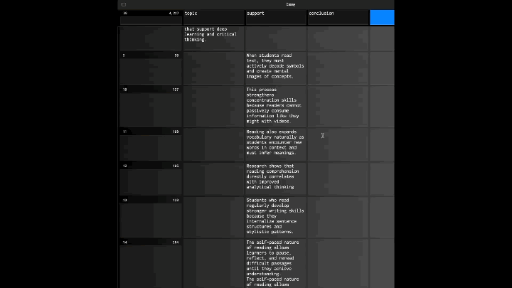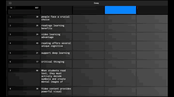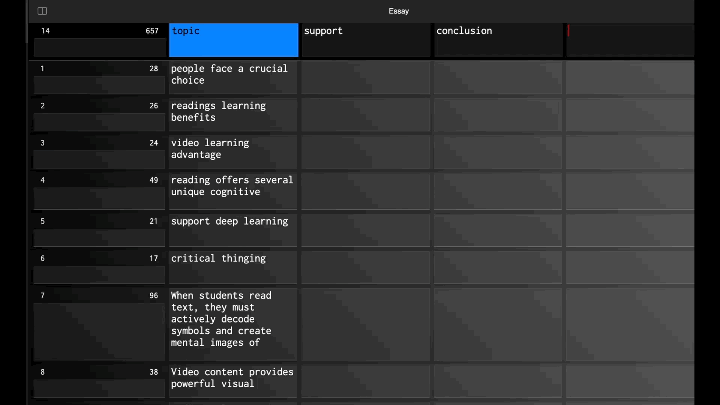 - Enter !c(h) in the header key cell, or if groups are properly set up, enter "#". Only topic sentences will be extracted. Check the flow of your argument.